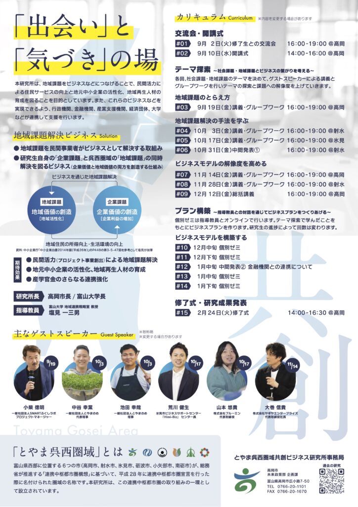 地域課題をビジネスで解決するために行政機関、金融機関、産業支援機関、大学などが支援する「とやま呉西圏域共創ビジネス研究所」が第8期生を募集しています!また、荒川センター長が10/17「地域課題解決の手法を学ぶ」に登壇します。