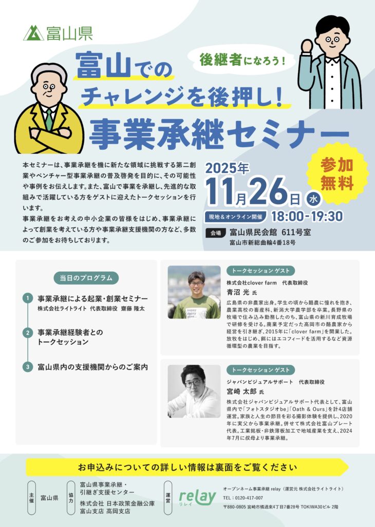 詳細はこちら:https://www.pref.toyama.jp/1300/event/20251126zigyousyoukeiseminar.html