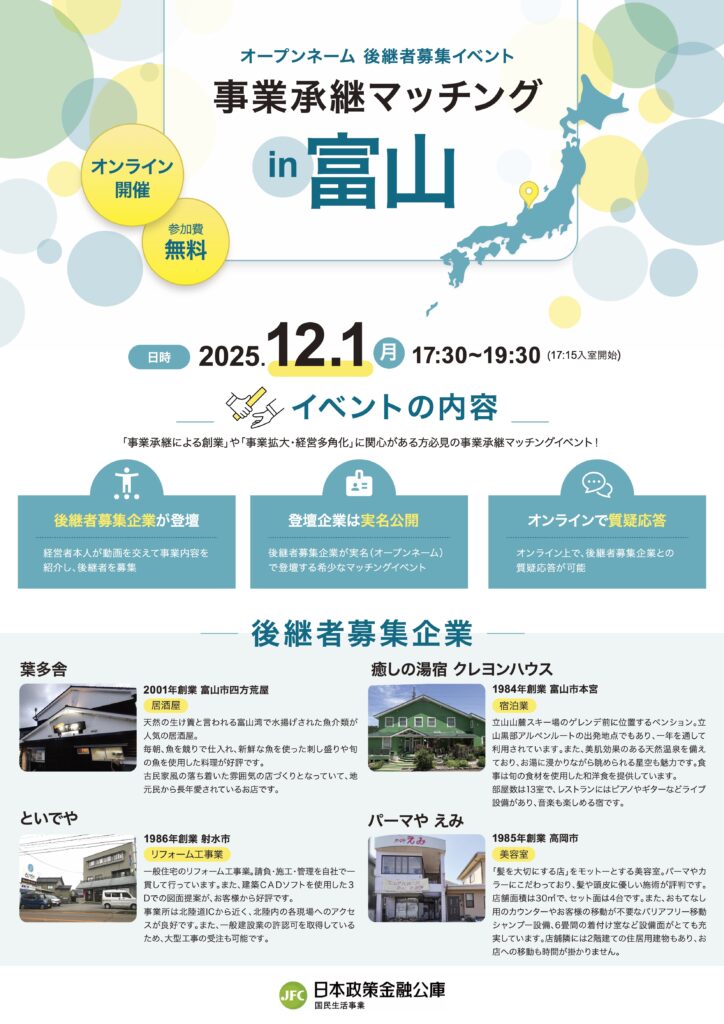 🟦「事業承継マッチングin富山」参加者募集(日本政策金融公庫)