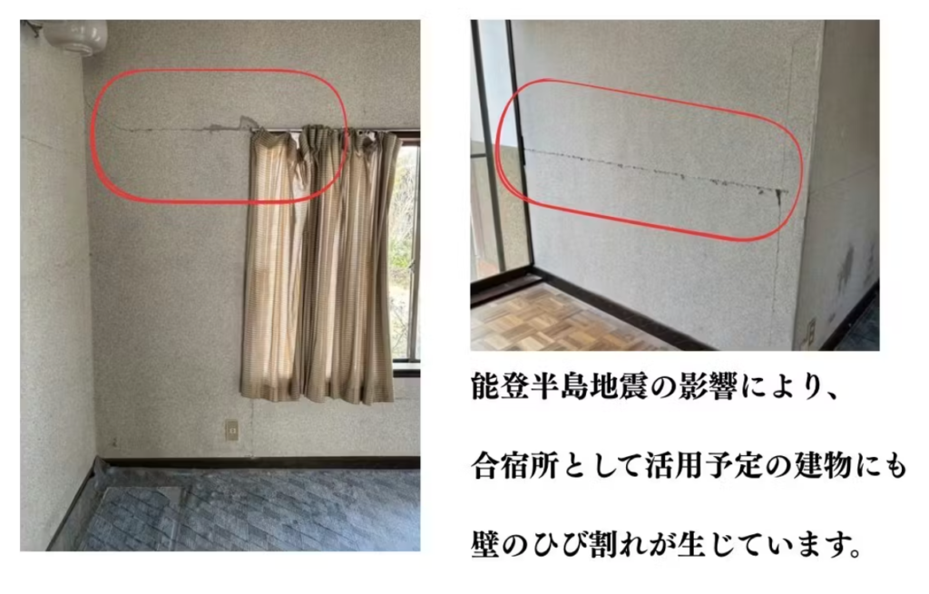 しかし、能登半島地震の影響により、合宿所として活用予定の建物にも壁のひび割れが生じています。震災を乗り越え、地域に再び人が集まり、子どもたちの声が響く場所をつくりたいという復興への想いも込めた挑戦です。