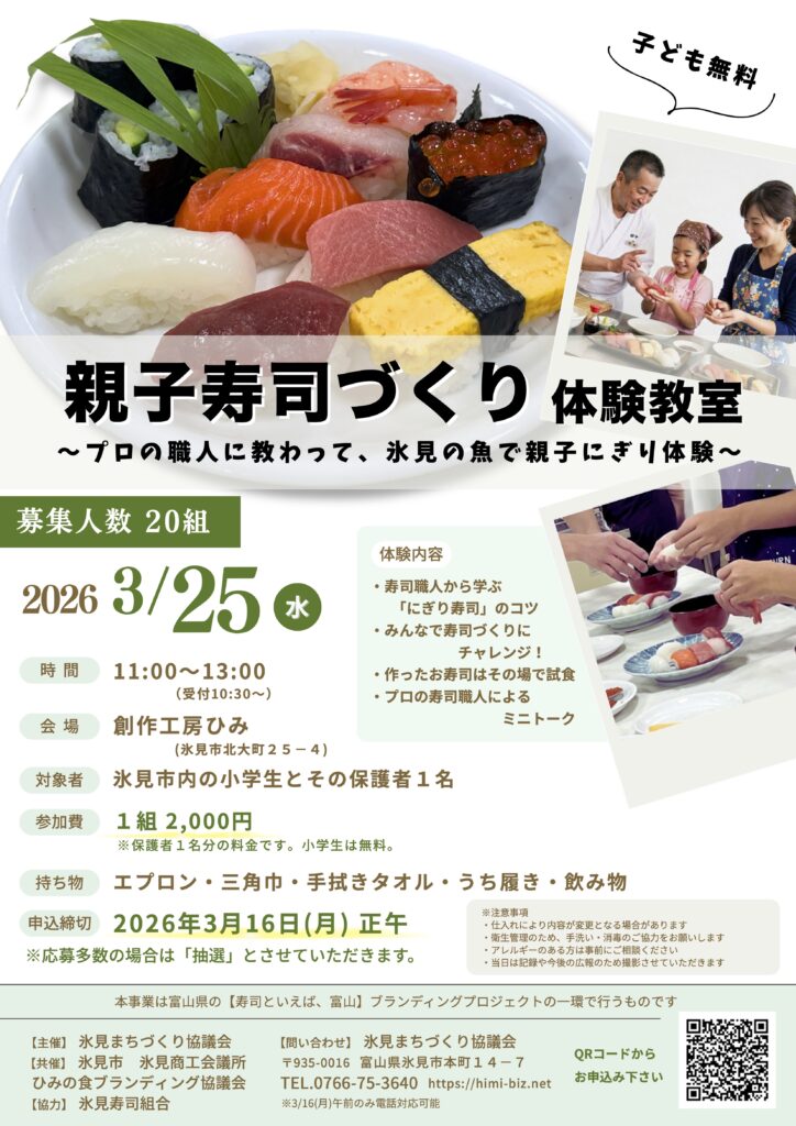 今回の寿司づくり教室は、氷見の伝統的な寿司文化を次世代へ継承するとともに、地元食材への理解を深めることを目的に実施。