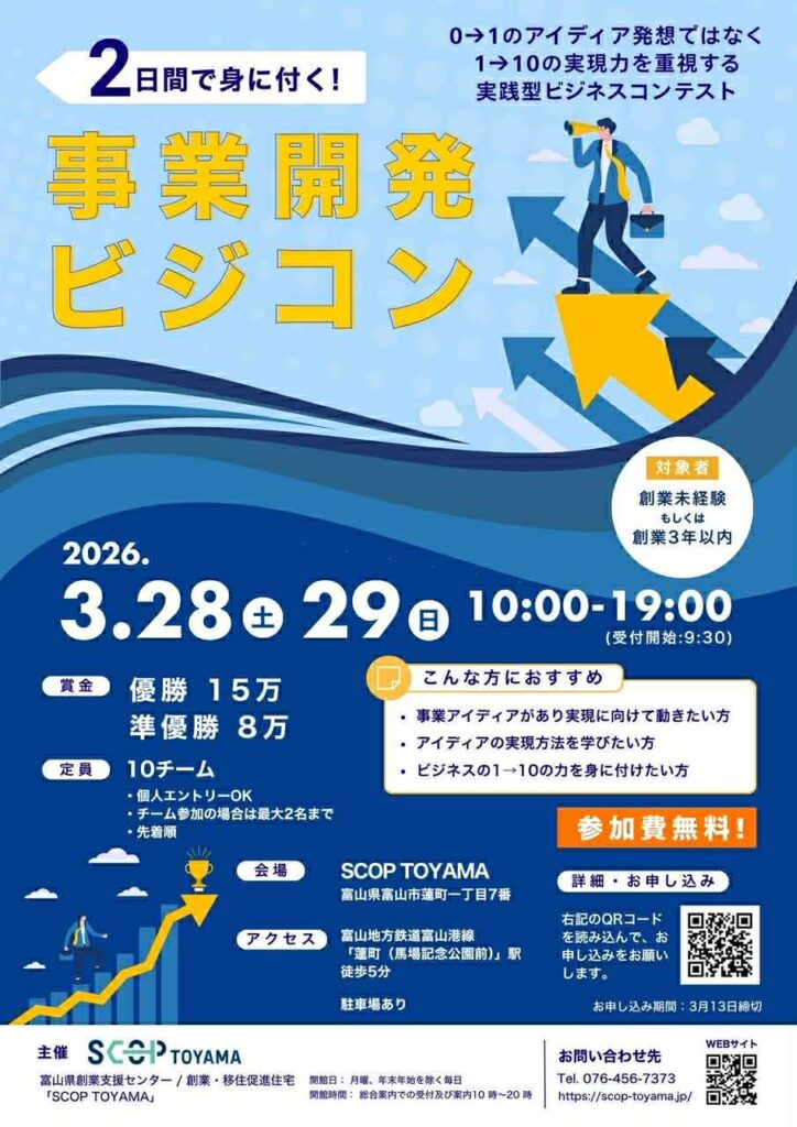 富山県創業支援センター/創業・移住促進住宅「SCOP TOYAMA」さん主催の「2日間で身に付く!事業開発ビジコン」に荒川センター長が審査員とし参加させていただきました。